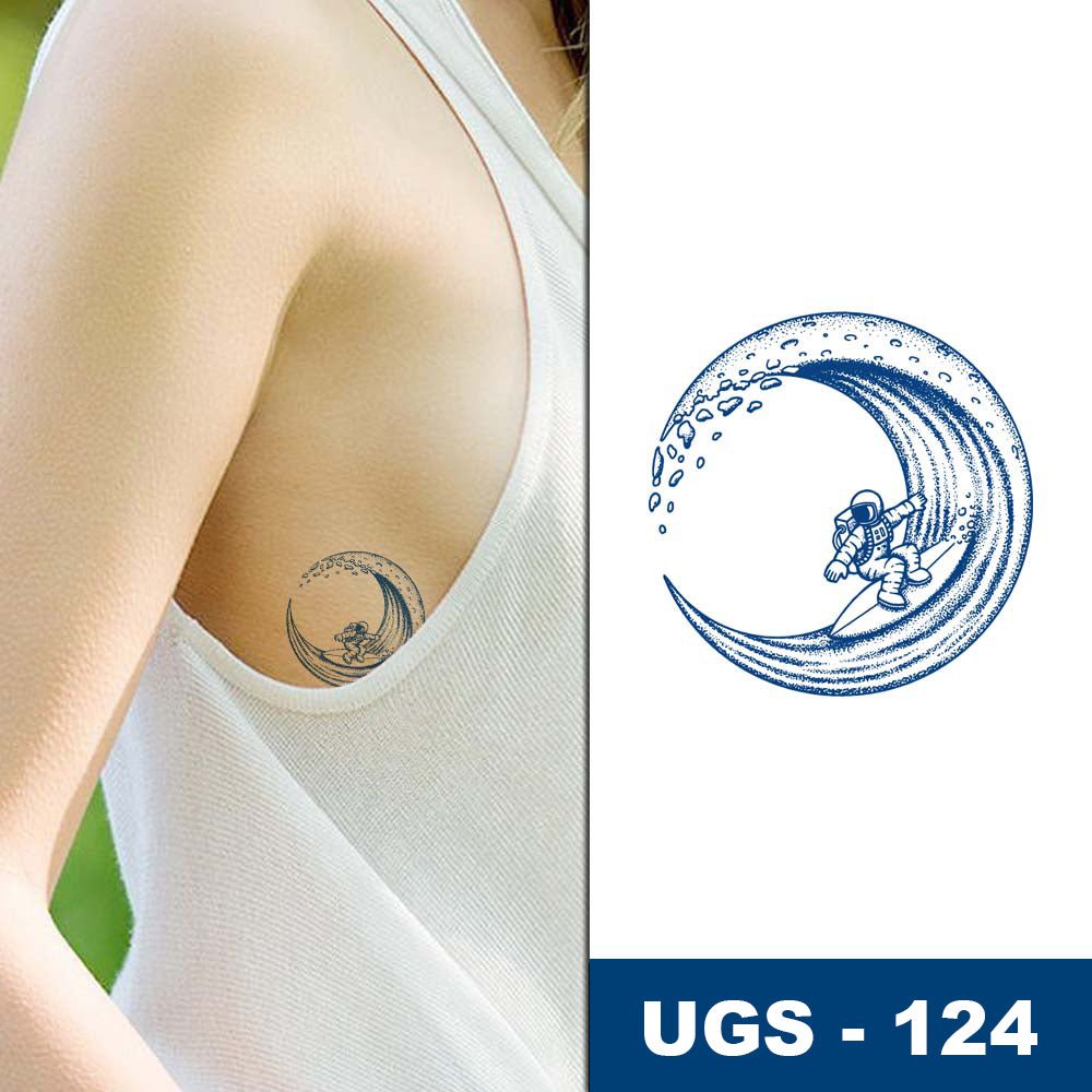 Laissez-vous transporter par ce design surréaliste qui fusionne l'infini de l'espace 🚀 et l'énergie de l'océan 🌊. Il présente un astronaute faisant du surf sur une vague stylisée en forme de croissant de lune. Ce motif incarne le rêve, le dépassement des limites et l'idée que l'aventure véritable se trouve au-delà de ce qui est connu. C'est le tatouage parfait pour ceux qui ne craignent pas l'inconnu et qui surfent sur les vagues de la vie, même si elles les emmènent aux confins de l'univers.