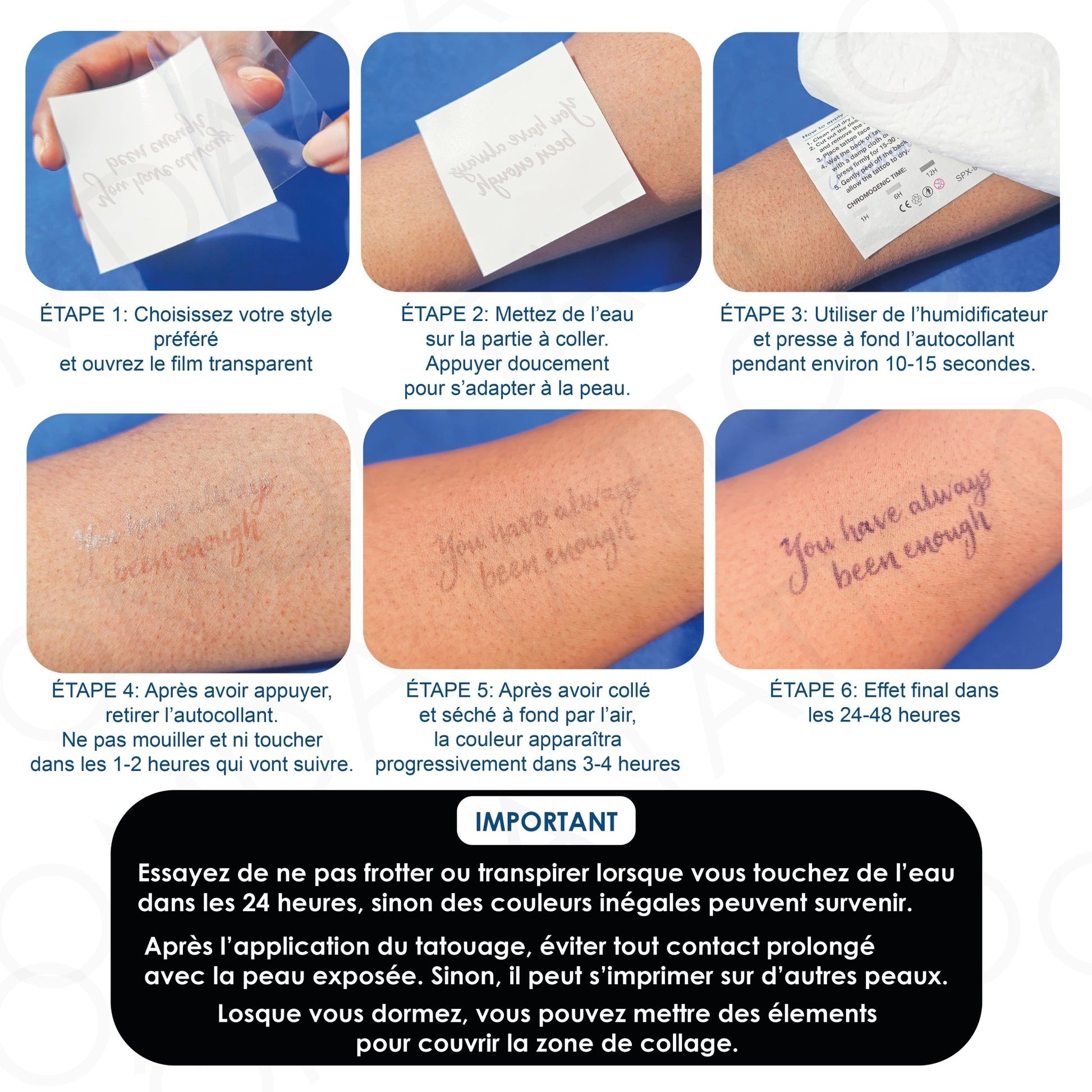 Ténacité : Impossible de le retirer une fois placer. - Sécurité : Nos tatouages ont été soumis à des rapports de surveillance de sécurité au laboratoire