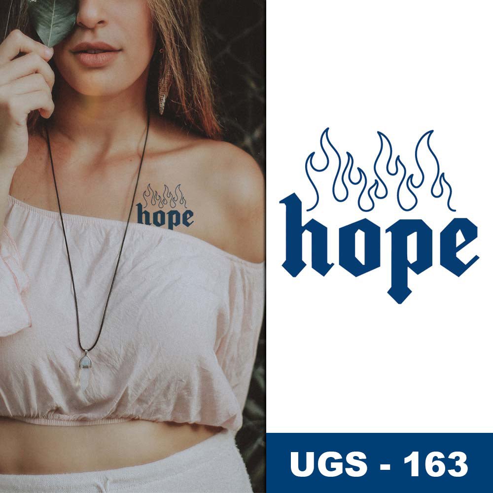 Ce tatouage affiche le mot “Hope” (Espoir) orné de flammes délicates, symbole de la lumière qui persiste même dans les moments sombres. Son design audacieux et élégant allie modernité et intensité, parfait pour ceux qui croient en la force intérieure et en la renaissance. Avec sa finition bleu profond et son effet mat, il attire l’œil tout en restant raffiné et significatif.